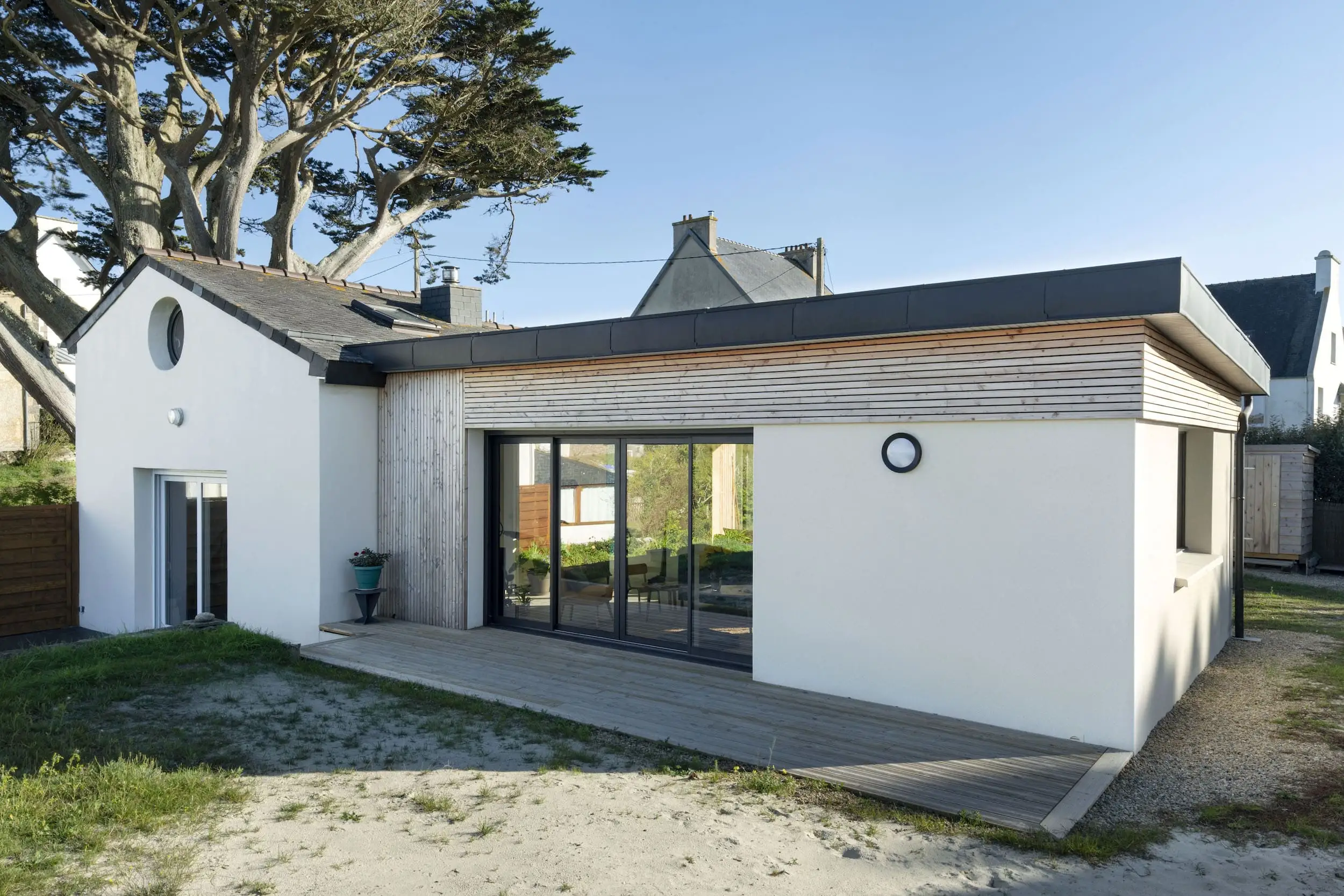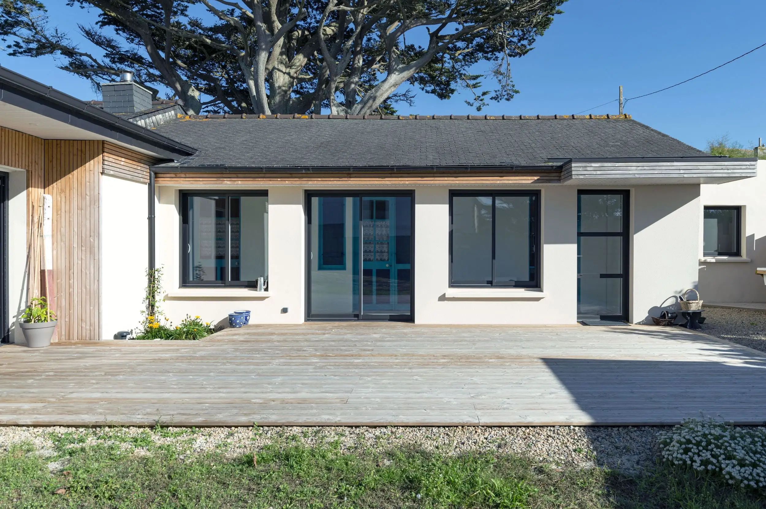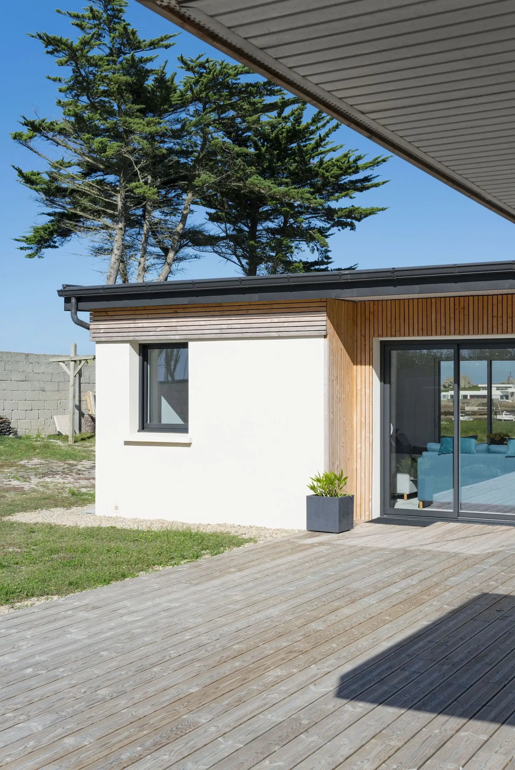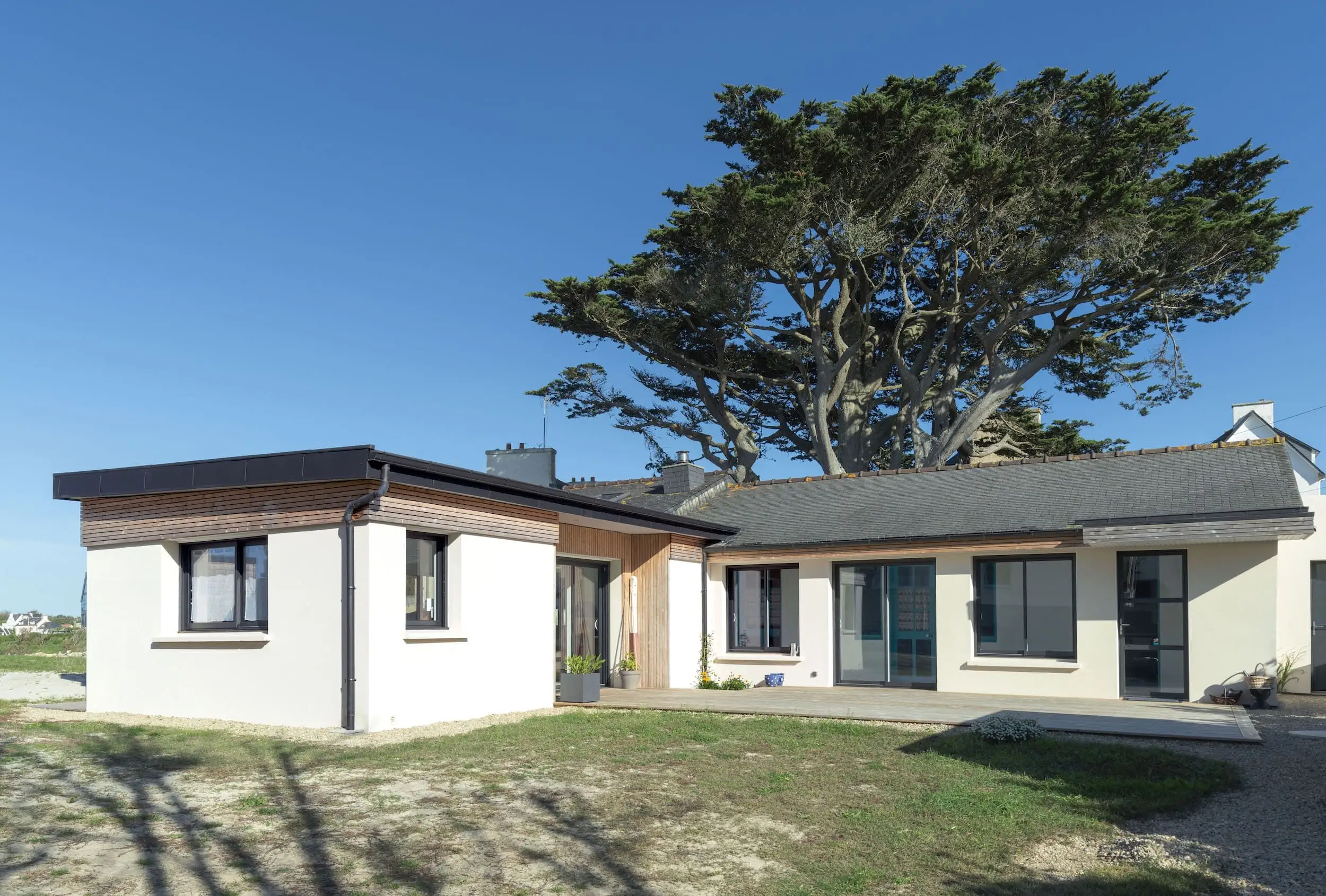 L’extension est réalisée en parpaings enduits, complétée par un bardage en Douglas à claire-voie, avec un bandeau bois assurant une liaison harmonieuse avec l’existant. Aujourd’hui, la maison bénéficie d’espaces lumineux ouverts sur le paysage, alliant confort contemporain et respect du caractère d’origine.