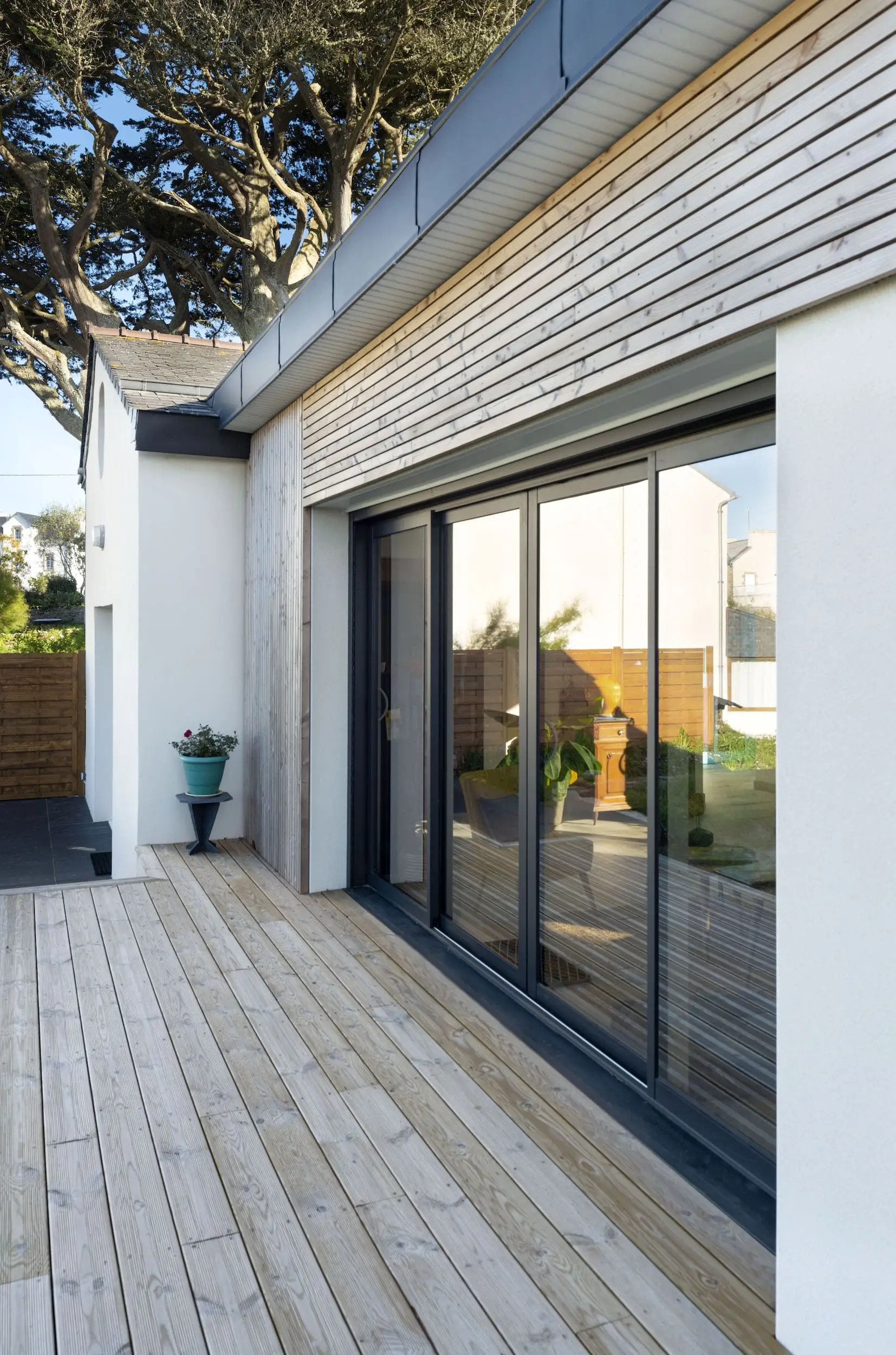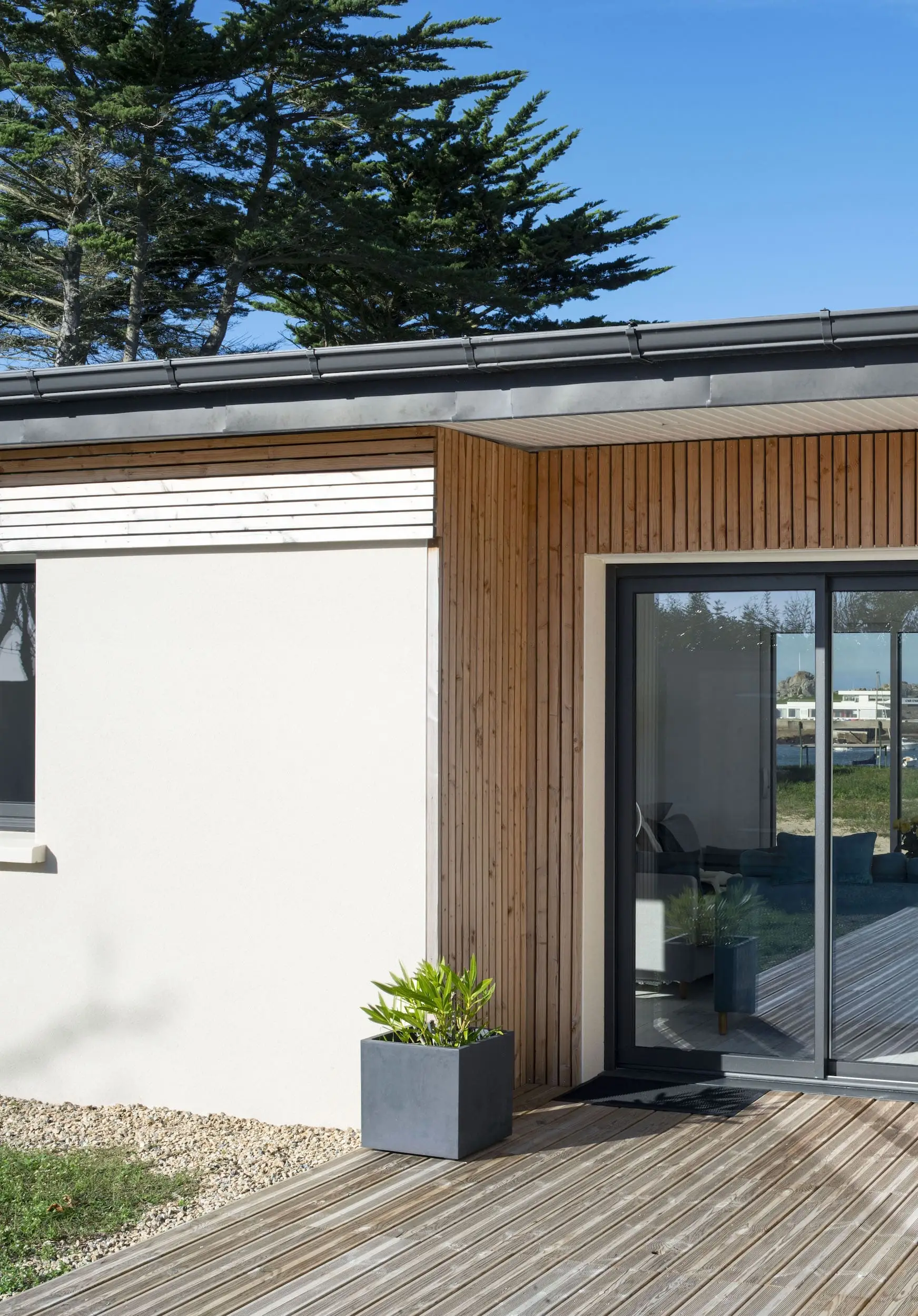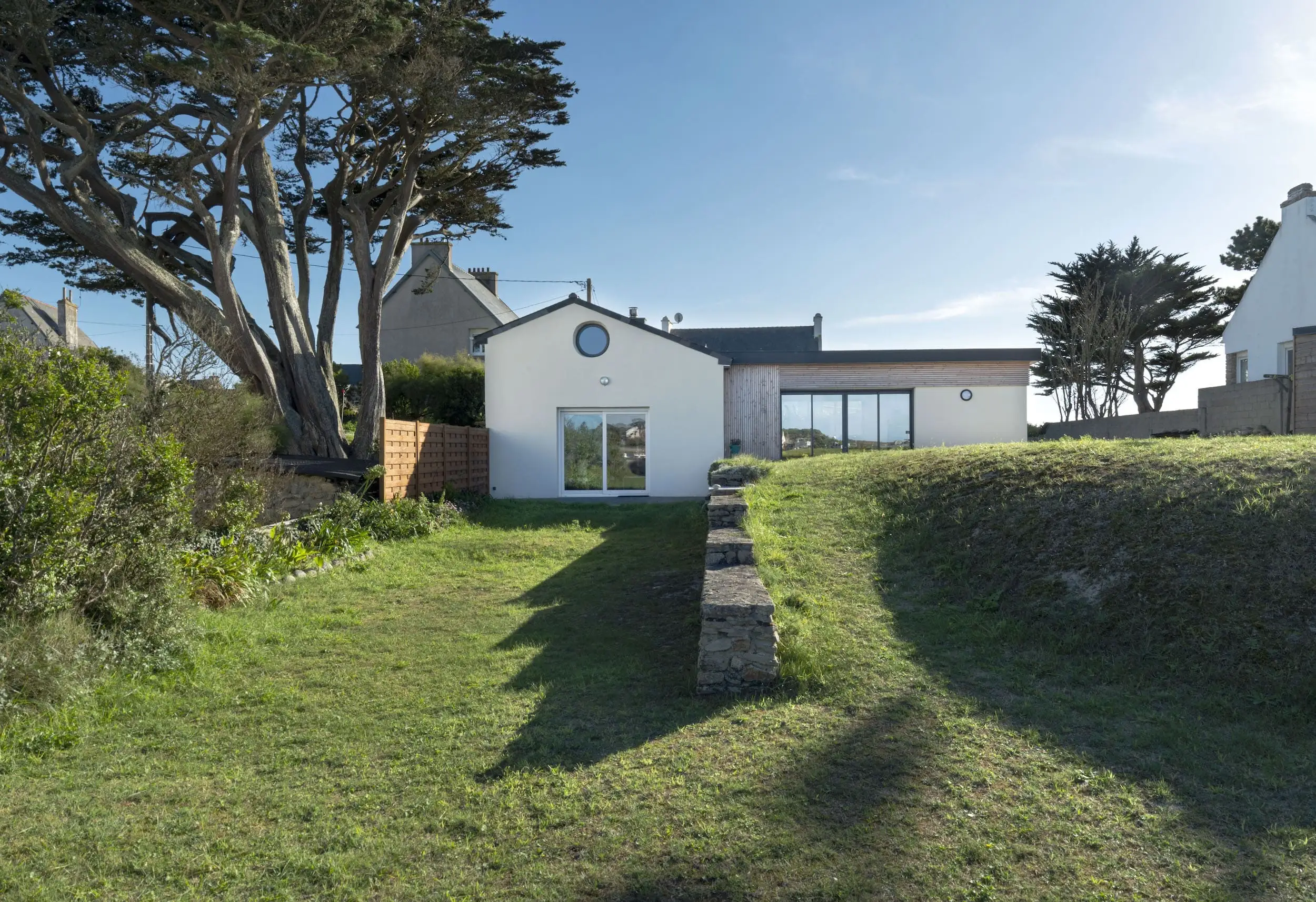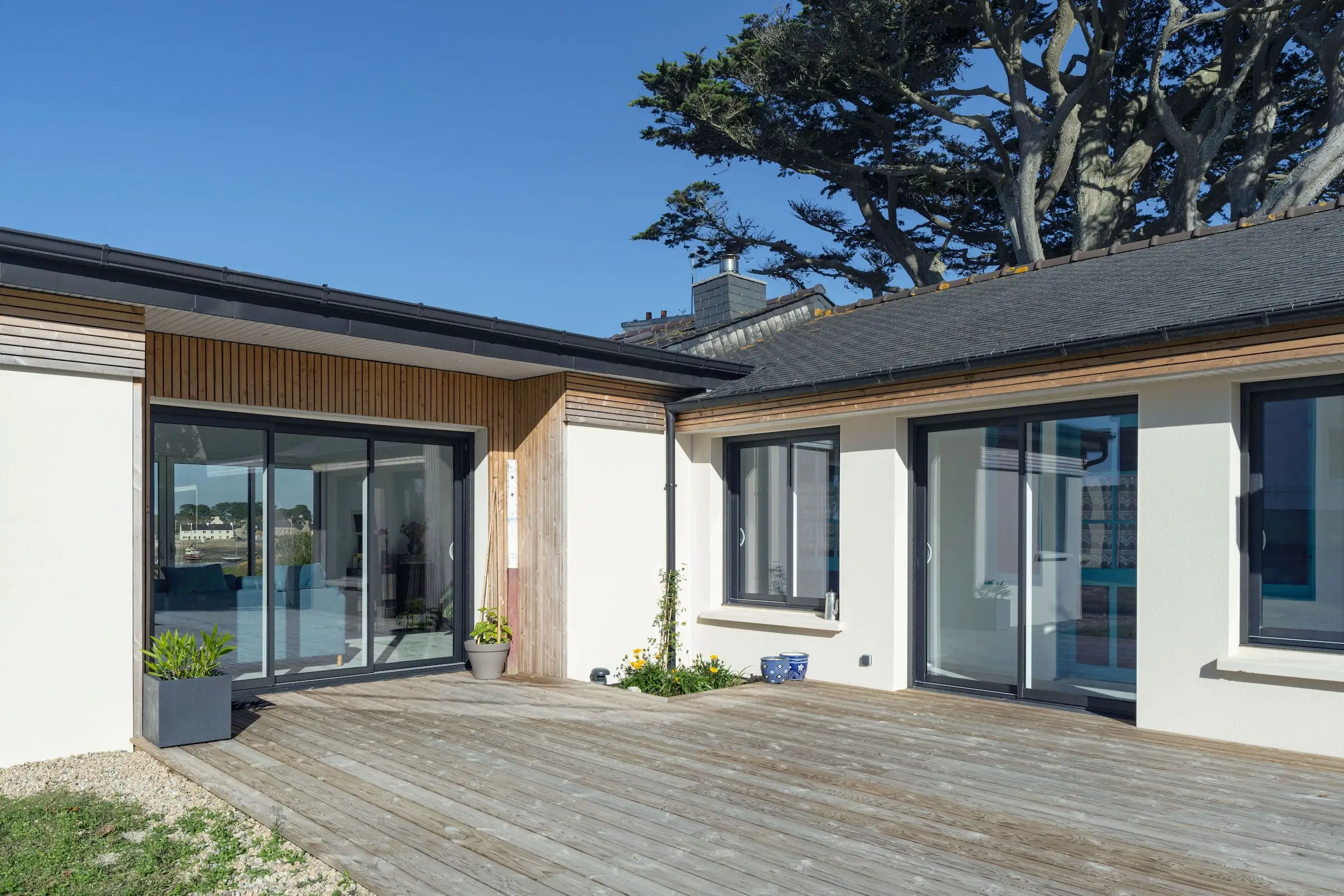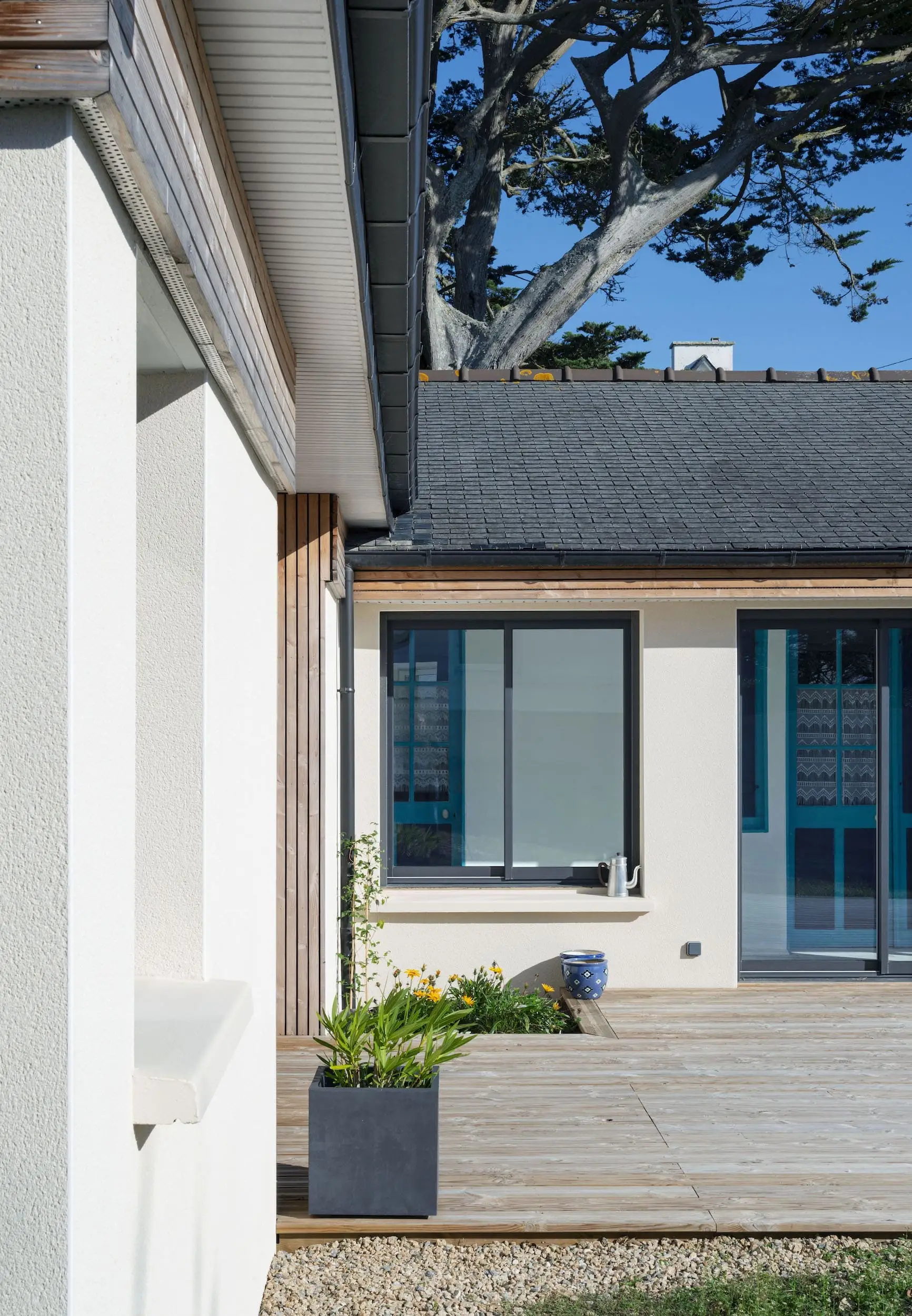 L’extension est réalisée en parpaings enduits, complétée par un bardage en Douglas à claire-voie, avec un bandeau bois assurant une liaison harmonieuse avec l’existant. Aujourd’hui, la maison bénéficie d’espaces lumineux ouverts sur le paysage, alliant confort contemporain et respect du caractère d’origine.