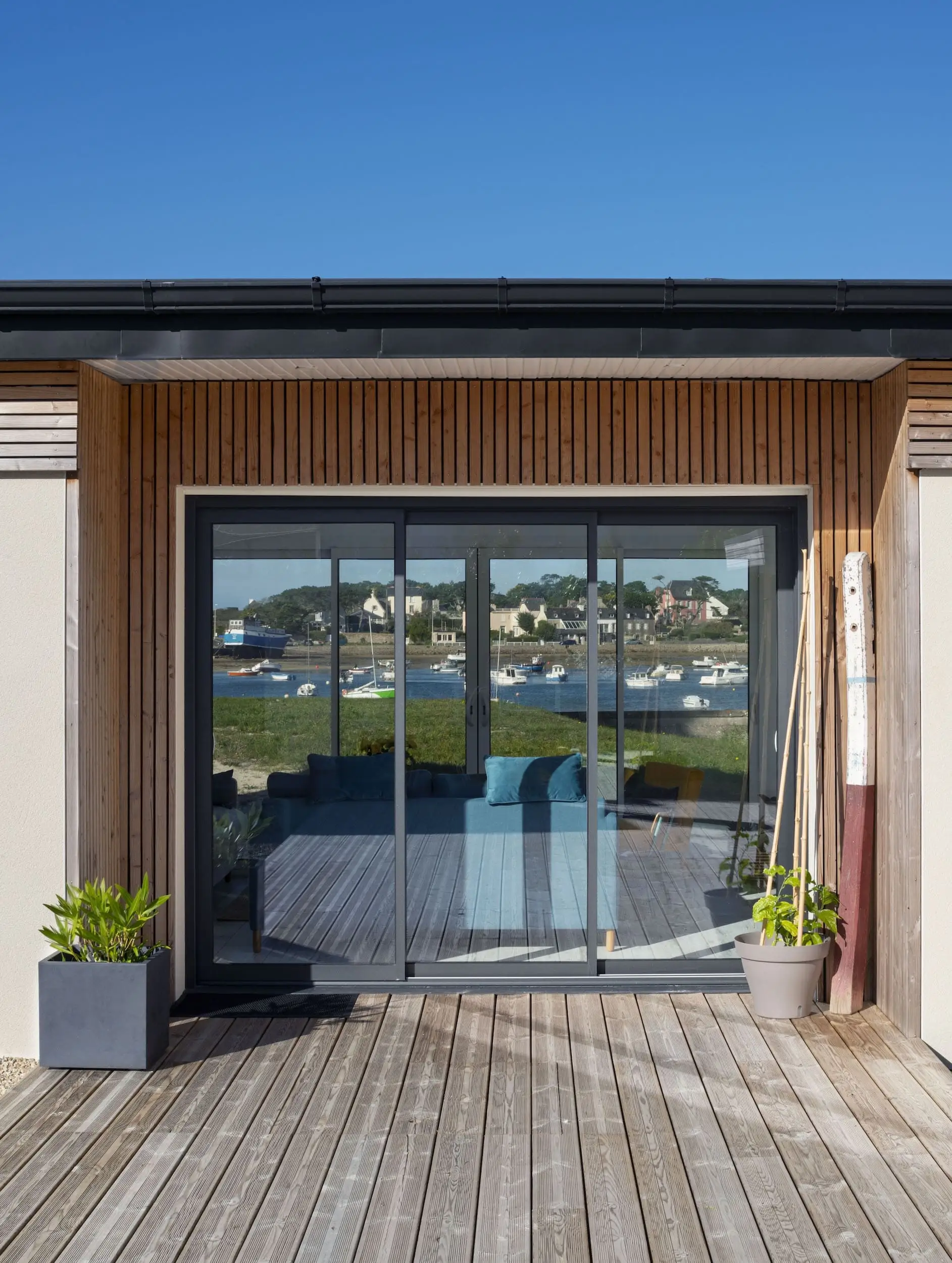 Une extension de 30 m² a été créée pour accueillir un nouveau salon, largement ouvert sur l’extérieur grâce à une grande baie vitrée offrant une vue directe sur la plage et la mer. Le salon est traversant, avec une seconde baie donnant sur le jardin et la terrasse.