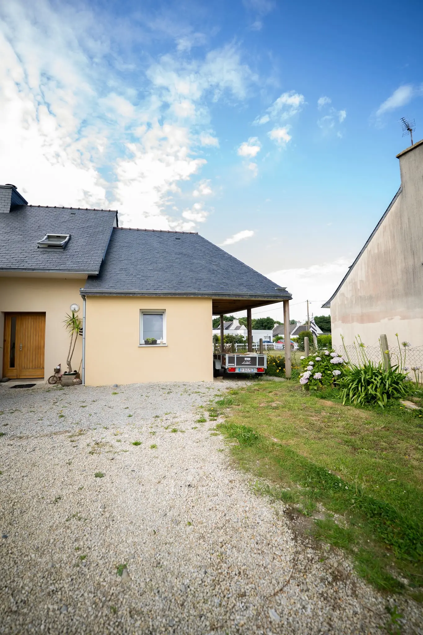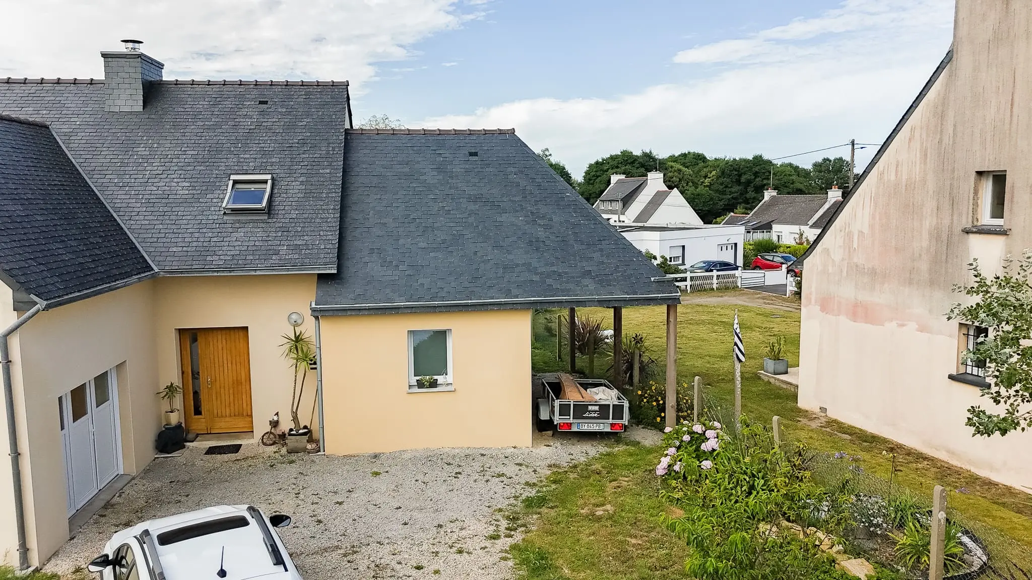 Le projet respecte la continuité architecturale de la maison existante, avec parpaings enduits de même teinte, menuiseries blanches et toiture en ardoises. Le toit a été prolongé afin de créer un espace carport intégré.
