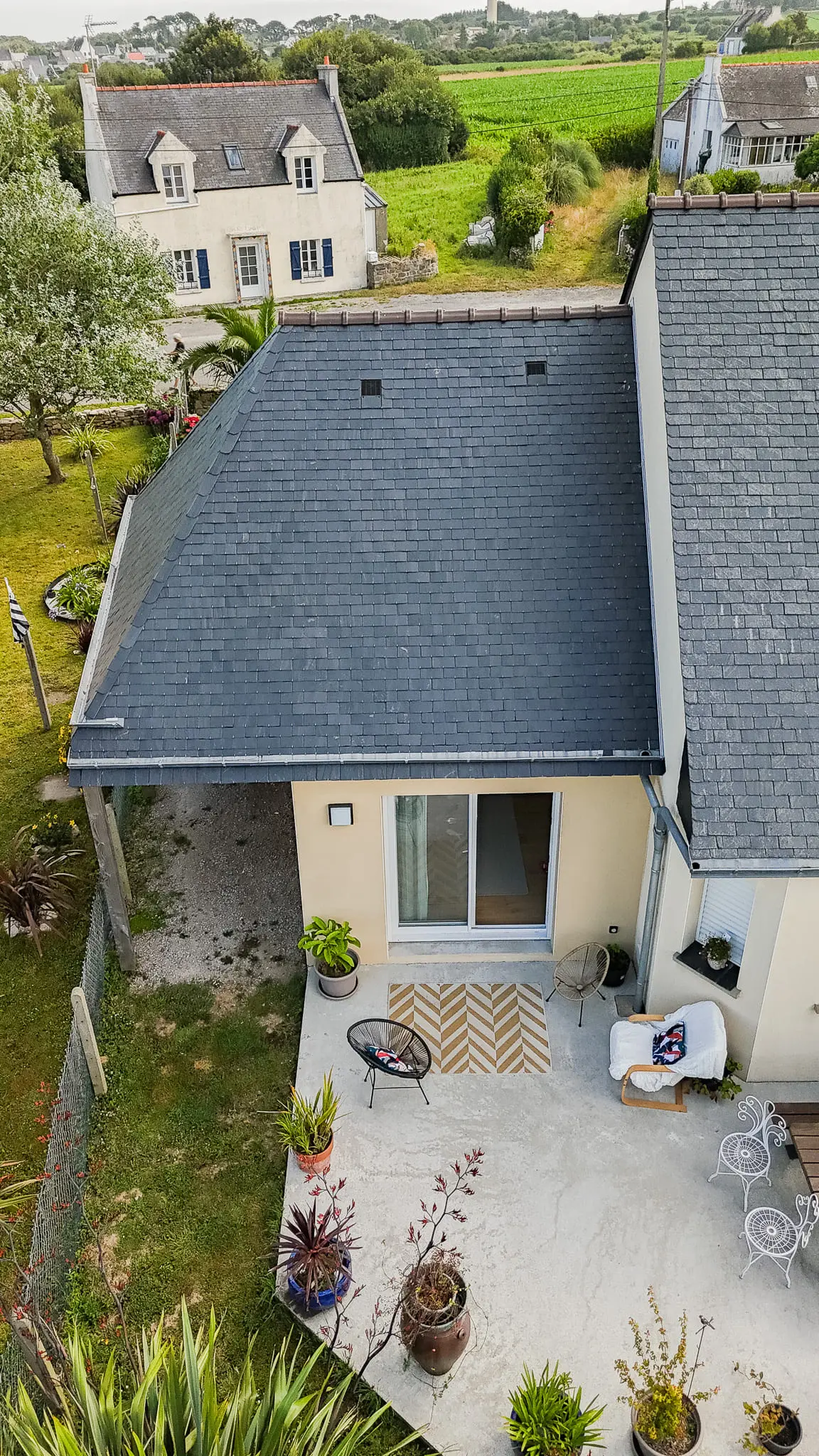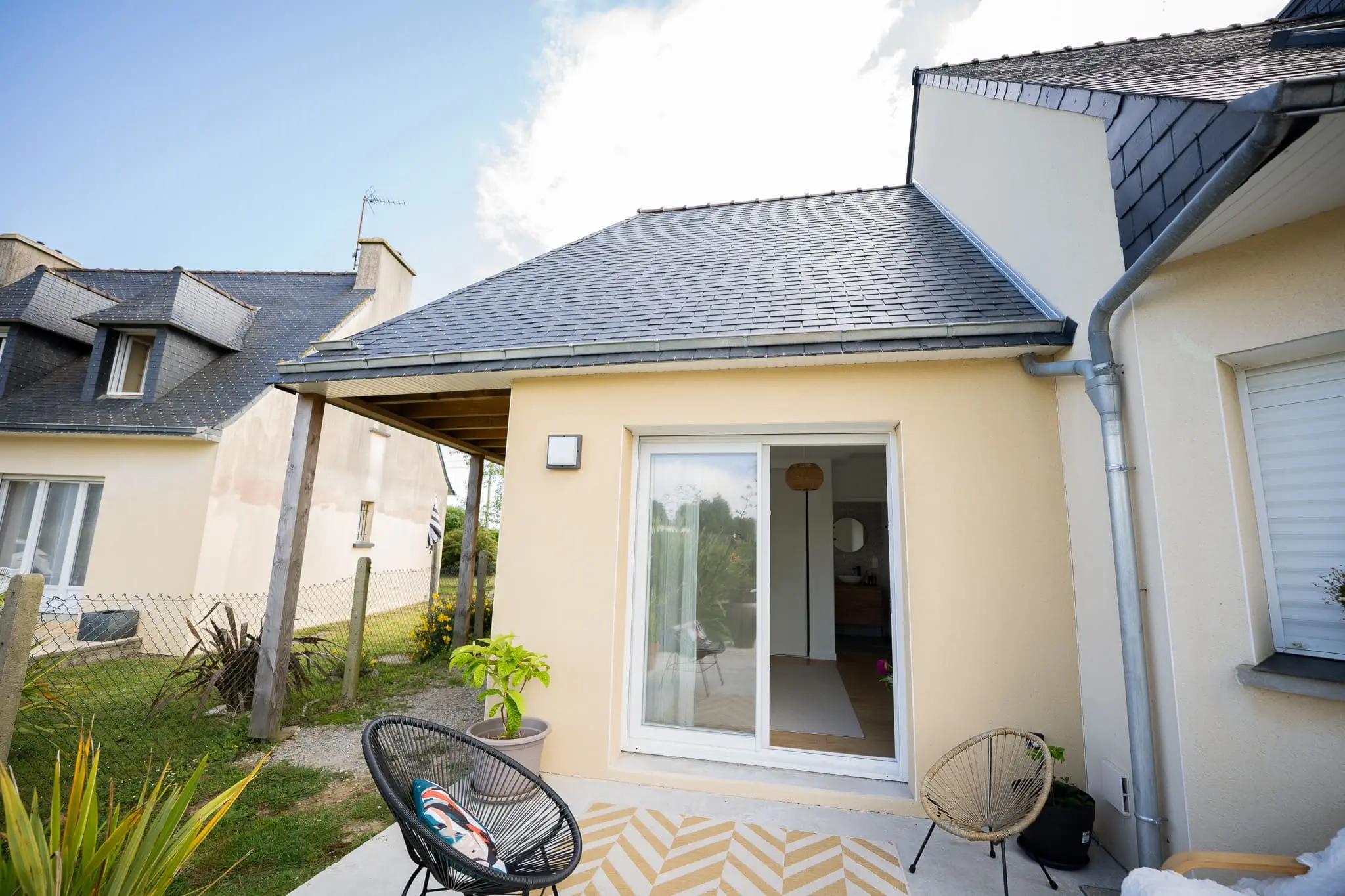 Une extension de 20 m² a été créée en pignon de la maison, comprenant une chambre ouverte sur le jardin et une salle d’eau équipée d’un grand receveur. L’ensemble a été pensé pour offrir confort, accessibilité et luminosité.